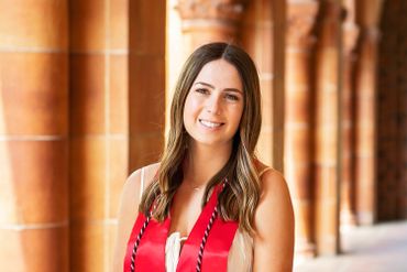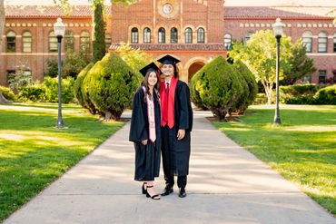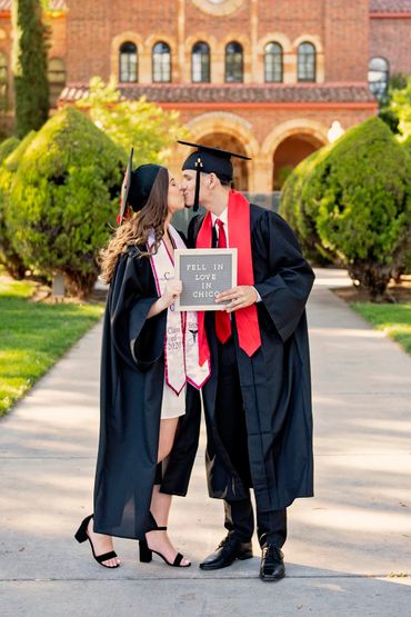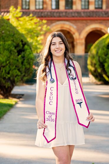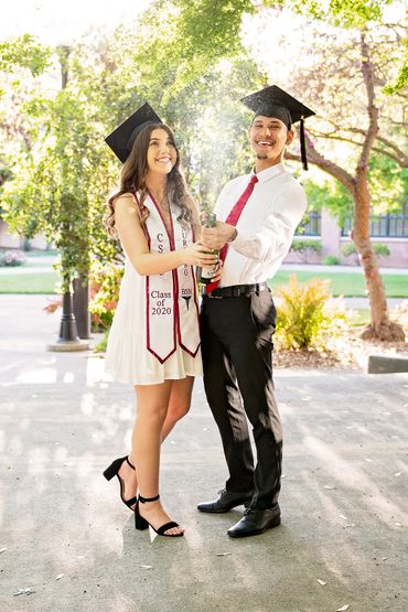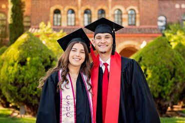 Chico State: Black cap/gown, red CSU stole, red tassel